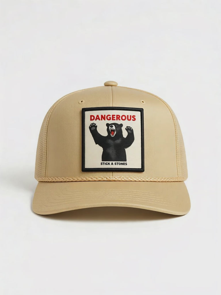 The backerton X Sticks & Stones "DANGEROUS" Stanley Trucker Hat in tan isn’t your average cap—it rocks a rope detail for double the edge. Featuring a sharp embroidered felt patch, this 5-panel custom trucker is designed and assembled in the USA. With a classic snapback closure, a durable poly-cotton front, and a breathable mesh back, it offers a structured crown and a bill you can curve your way.