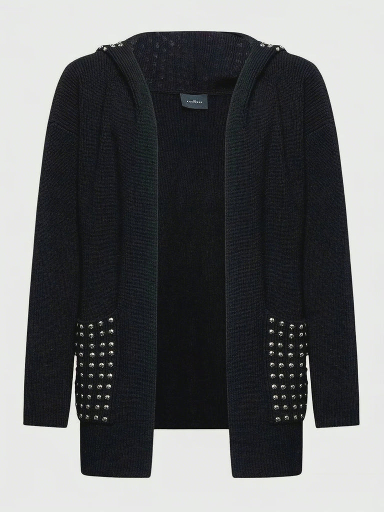 Metal studs cover the hood and pockets, delivering that raw, edgy aesthetic. Ribbed merino construction adds serious texture and dimension. Pure 100% merino wool.