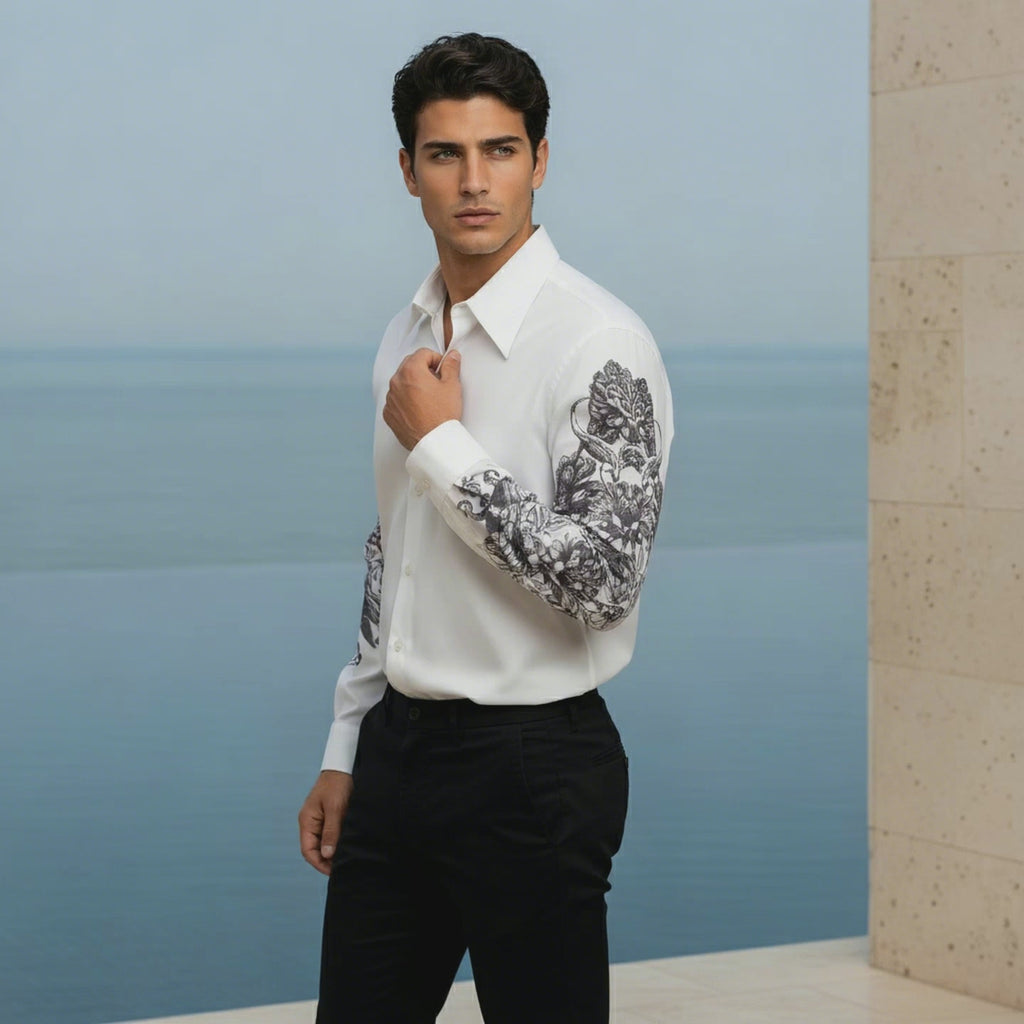 Elevate your wardrobe with John Richmond's "YELDE" silk shirt—a rock and roll essential that refuses to blend in. Pure white silk serves as the perfect canvas for bold black floral graphics that command attention on the sleeves. This isn't your standard formal wear; it's a statement piece that bridges the gap between refined tailoring and rebellious edge.
